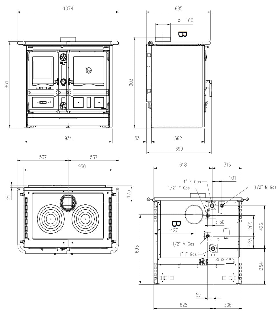 Średnica wyjścia spalin : 150 mm ( tylko z prawej strony , z tyłu lub z góry )