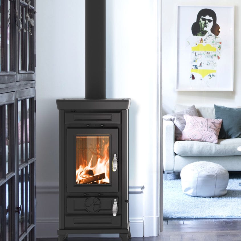 Nowoczesny piecyk na drewno w klasycznym designie na nóżkach.