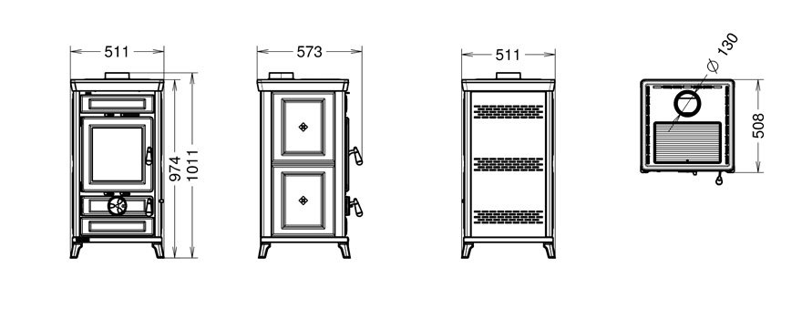 Duża prosta szyba paleniska z drzwiczkami żeliwnymi otwieranymi do boku. Góra piecyka z żeliwa z górnym wylotem spalin. Wnętrze paleniska jest żeliwne z popielnikiem wysuwanym poniżej, za dodatkowymi drzwiczkami.