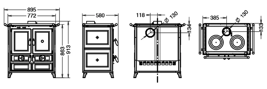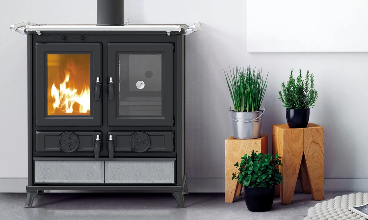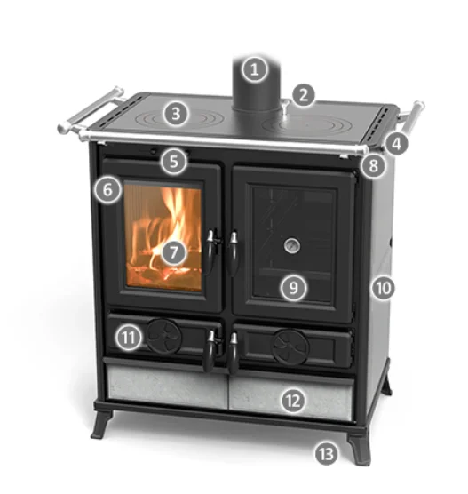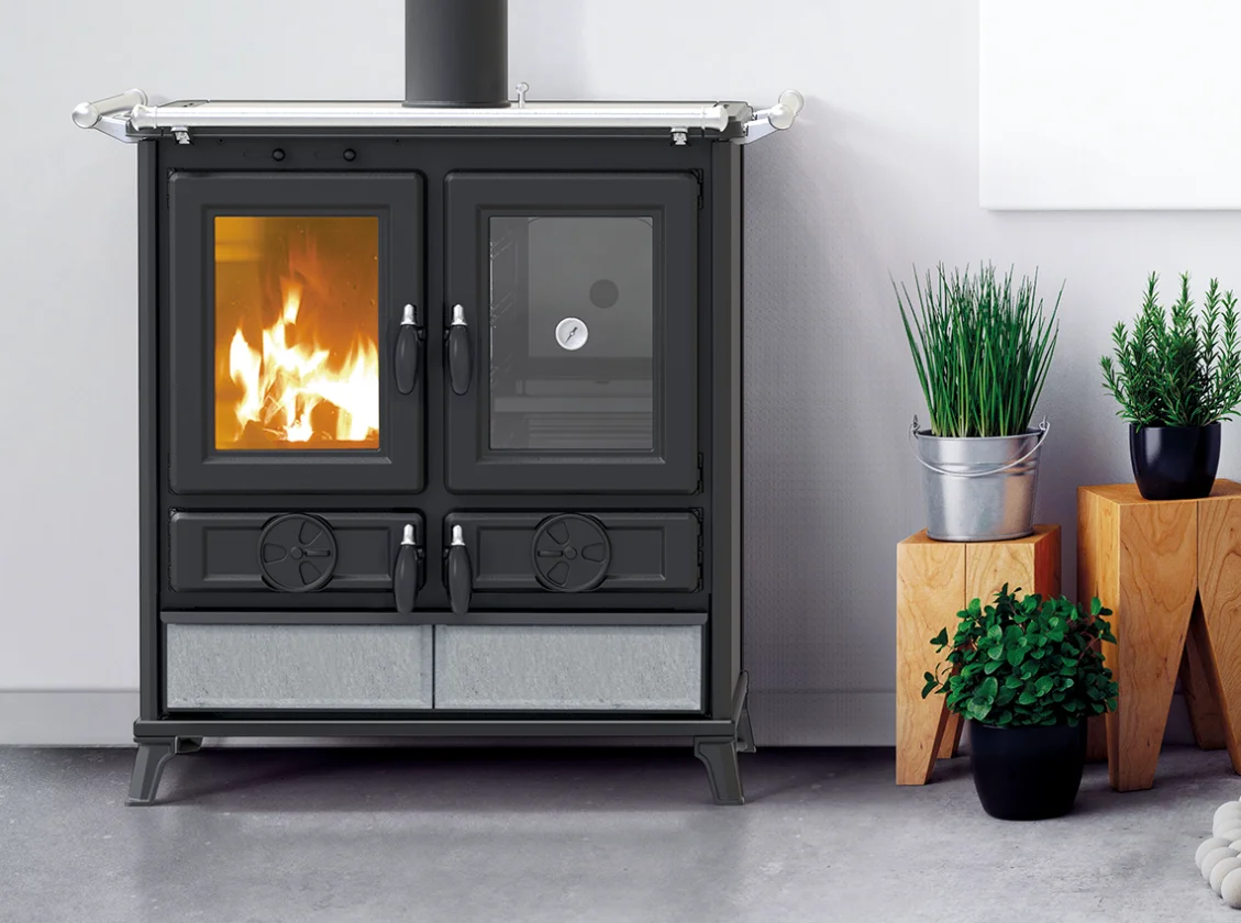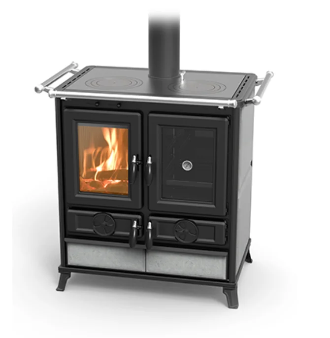 Kuchnia jest wyposażona w piekarnik znajdujący się obok paleniska. Piekarnik posiada osobne drzwiczki z termometrem, co umożliwia komfortowe pieczenie potraw. Dodatkowo na górze kuchni wolnostojącej znajduje się płyta grzewcza z fajerkami. W rezultacie dzięki jednemu piecykowi zyskujemy możliwość ogrzewania, gotowania i pieczenia jednocześnie. Kolejnym atutem kuchni na drewno jest niezależność jaką nam dają. Nawet w przypadku przerw w dostawie mediów w naszym domu jest ciepło i pachnie domowym obiadem, pizzą czy ciastem.
