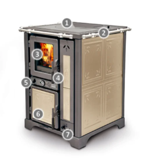 | 1 – wylot spalin fi 150 z dodatkowym szybrem, dzięki któremu rozpalanie pieca jest łatwiejsze 2 – relingi boczne (opcja dodatkowo płatna) 3 – duże palenisko z żeliwnym rusztem 4 – „zimna” rączka do otwierania drzwi 5 – automatyczna kontrola spalania drewna 6 – zdobiona ceramika Maiolica 7 – system czyszczenia Wylot spalin z tyłu i od góry. |
