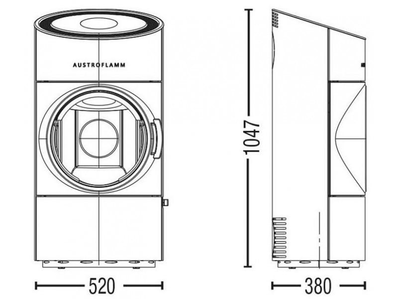 Piecyk Austroflamm CLOU COMPACT, konstrukcja stalowa, korpus wykonany ze stali, komora wyłożona Keramottem. Palenisko nie posiada rusztu, przez co jest bardziej szczelne.