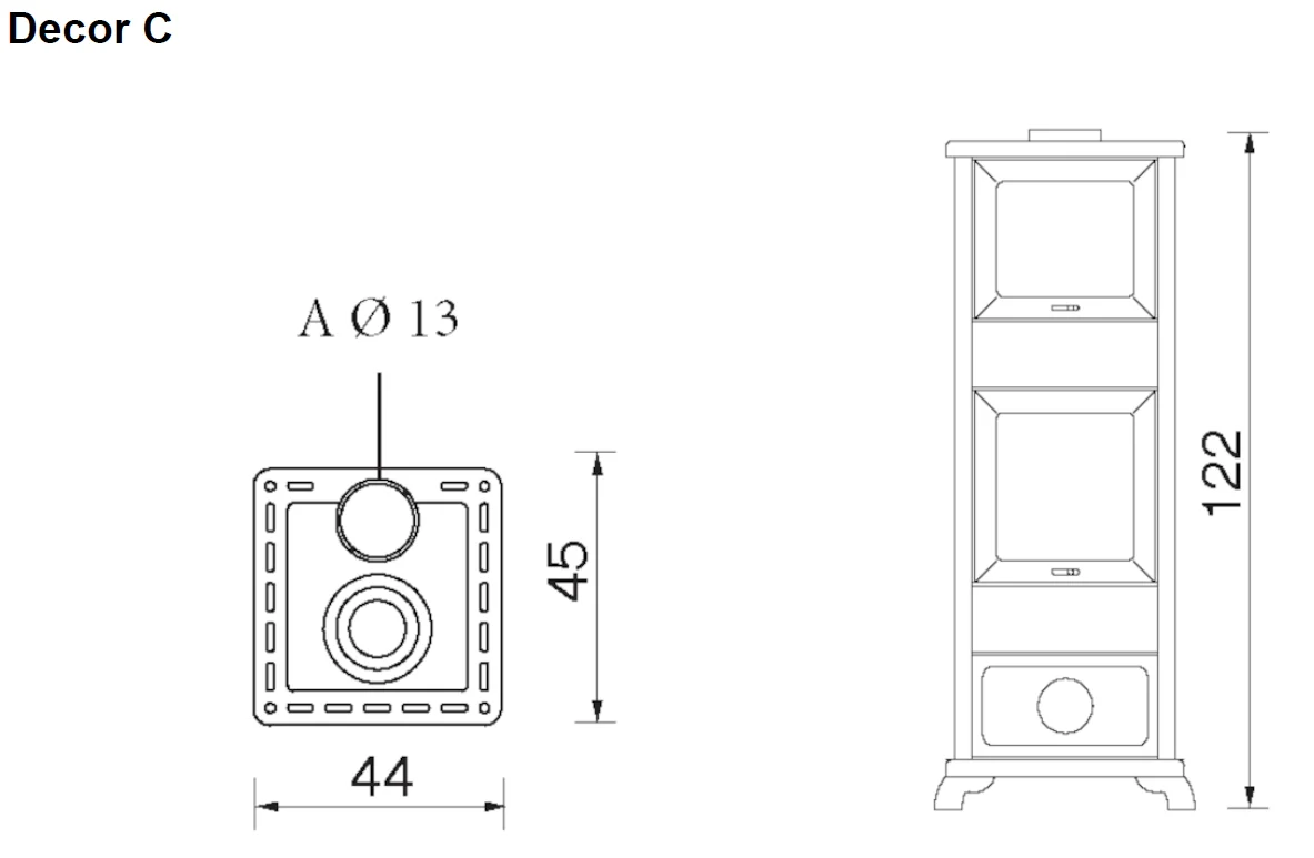 Kominek wolnostojący Decor C jest wyposażony w piekarnik znajdujący się nad paleniskiem. Piekarnik posiada osobne drzwiczki, wyposażone w termometr. Dzięki temu pieczenie przy pomocy tego pieca jest jeszcze łatwiejsze i przyjemniejsze. Piekarnik posiada wymiary 27x30x24 cm.
