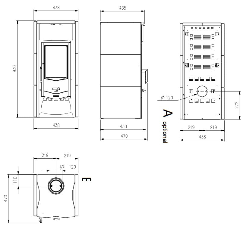 Średnica wyjścia spalin : 120 mm ( wyjście spalin tylko z góry )