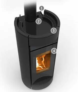 1. Modulacja powietrza pierwotnego, wtórnego i dopalania spalin 2. „Smoke by-pass” to technologia dzięki której zredukowane jest wydymianie w trakcie dokładania drewna 3. Żeliwna góra 4. Drzwi paleniska wykonane są z żeliwnej ramy (od wewnątrz paleniska) i szkła (od zewnątrz) Dodatkowo szklana górna płyta na piecu dzięki której możliwe podgrzewanie potraw- Hot Plate. |