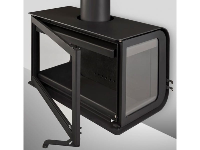 Designerski piec kominkowy ROCAL CITY o konstrukcji stalowej. Palenisko wyłożone płytami wermikulitowymi w czarnym kolorze.  Palenisko bez rusztowe.