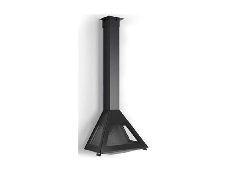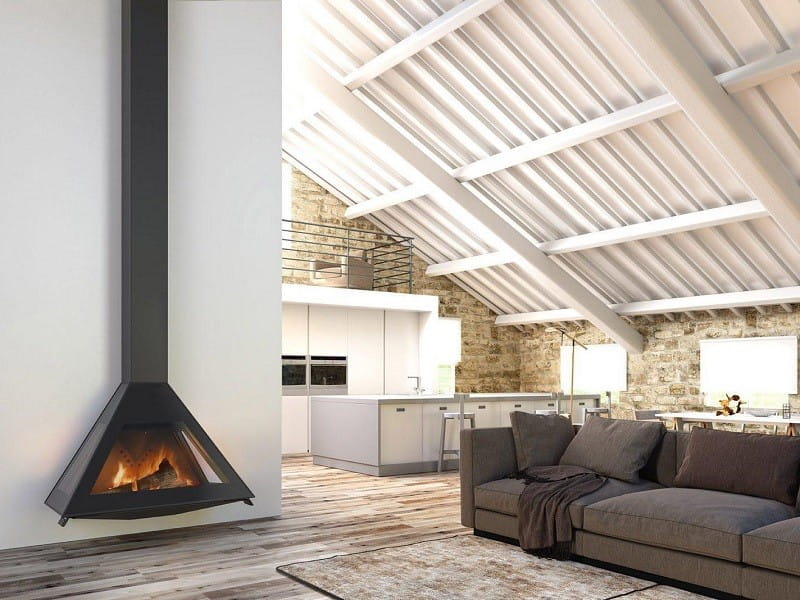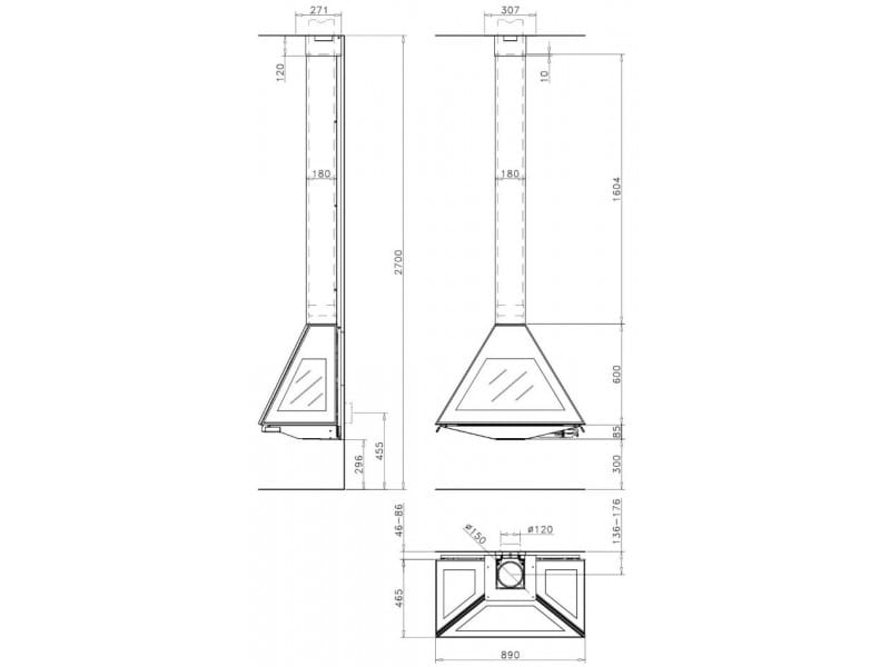 Designerski piec kominkowy ROCAL D10 o konstrukcji stalowej. Palenisko wyłożone płytami wermikulitowymi w czarnym kolorze. Palenisko bez rusztowe. Trójstronna wizja boczna.