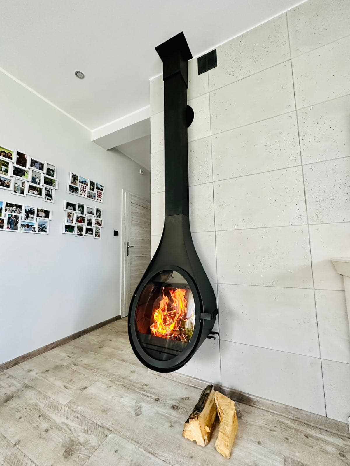 Designerski piec kominkowy ROCAL DROP o konstrukcji stalowej. Palenisko wyłożone płytami wermukulitowymi w czarnym kolorze. Palenisko wyposażone w ruszt i wyjmowaną szufladę na popiół.